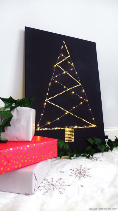 The fourth Christmas décor hack out of our 5 smart hacks for a cheap Christmas décor is a little bit similar to the first, but here, you are doing something else with your lights. You are not coating them in gold paints, instead, you are pinning them onto a canvas to form a Christmas tree. The canvas can be hanged on the wall, or you could just place them in a perfect corner, where you can also get to display your Christmas gifts.